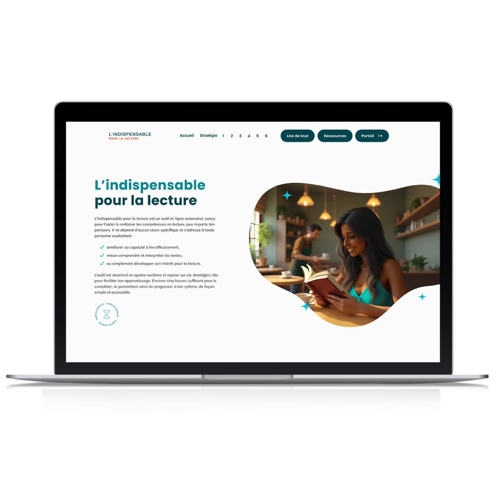 Une attention particulière a été portée à l’environnement numérique d’apprentissage : quatre ambiances visuelles permettent de personnaliser l’expérience selon les goûts littéraires, tandis que des personnages animés accompagnent la personne apprenante tout au long du parcours. Par son approche dynamique et transférable, L’INDISPENSABLE pour la lecture soutient le développement des compétences en lecture dans tous les domaines d’apprentissage et encourage à devenir un lecteur ou une lectrice.